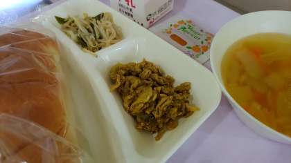 今日の給食は、豚肉のカレー風味焼き、はくさいのスープ、もやしとピーマンのいためもの、コッペパン、アプリコットジャム、牛乳です。