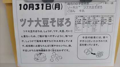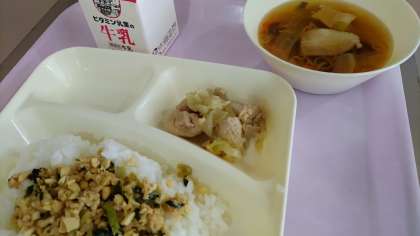 今日の給食は、鶏肉のゆず塩焼き、ソーキ汁、ツナ大豆そぼろ、ごはん、牛乳です。