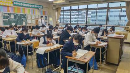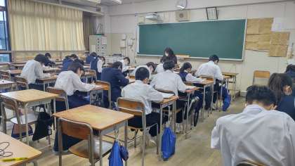 終学活や清掃活動が終わって4時を回ってスタートしましたが、会場となる教室前の廊下は、最終確認をする生徒たちであふれかえって熱気むんむん!それまでの興奮気味だった様子も、受験級別に分かれて会場に入った後は、真剣なまなざしと程よい緊張感に変わりました。