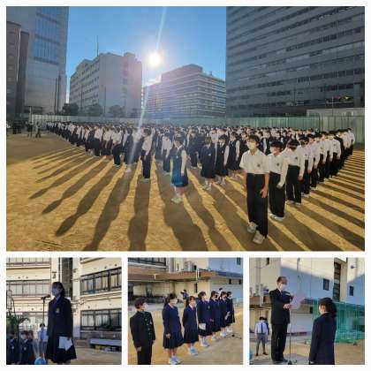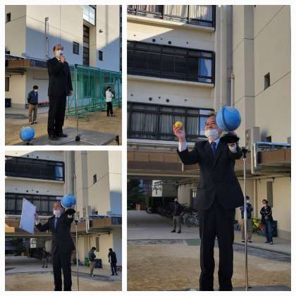 本日は、運動場で全校集会を行いました。バレーボール部の表彰伝達のあと、校長先生の講話があり、明日皆既月食と天王星食があるのでぜひ観測してほしいとのことでした。