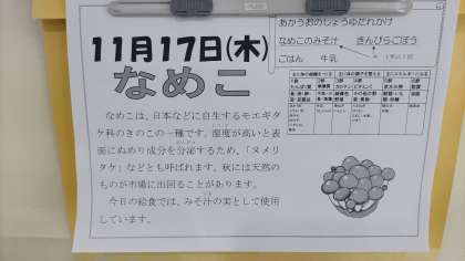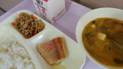 今日の給食は、あかうおのしょうゆだれかけ、なめこのみそ汁、きんぴらごぼう、ごはん、牛乳です。