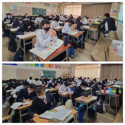 さて、本日の授業のようすです。皆さん、来週火曜日からのテストに向けて頑張りましょう。