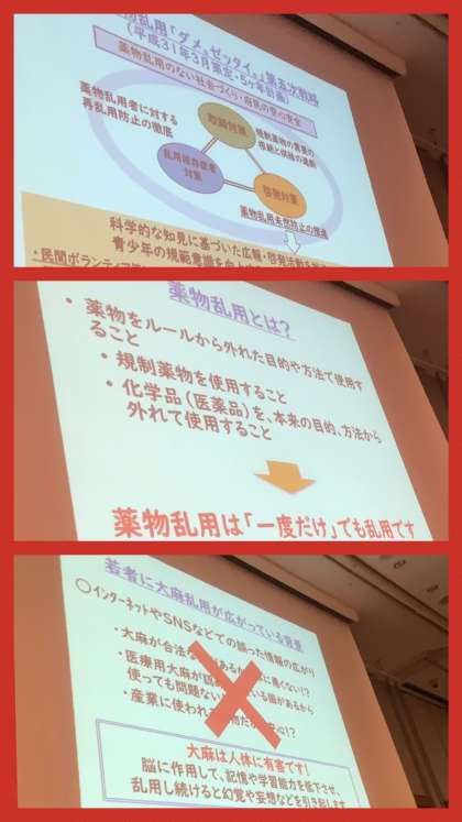 また、式典では、大阪府の薬物乱用防止(こちらをクリック)担当者さまより、薬物乱用防止の現状と課題や取組が紹介されました。薬物は「1度だけ」でも乱用です。興味本位で、自分の大切な命に大きなダメージを与えます。自分だけでなく、家族や仲間にも大きなダメージを与えます。