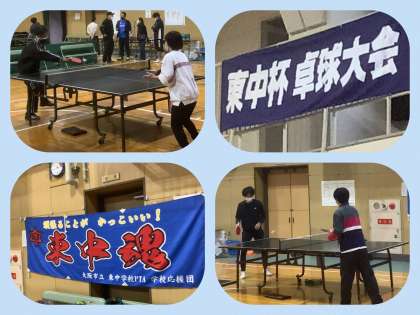 東中杯卓球大会が、3年ぶりに、感染症対策を徹底して行われています。前回優勝チームからの優勝カップの返還、PTA会長と校長先生からの挨拶、準備体操に続いて、熱戦が繰り広げられています。