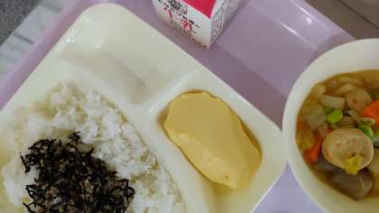 今日の給食は、卵どうふ、一口がんもと野菜の煮もの、魚ひじきそぼろ、ごはん、牛乳です。