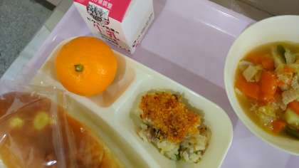 今日の給食は、きのこのドリア、鶏肉とじゃがいものスープ煮、みかん、おさつパン、牛乳です。
