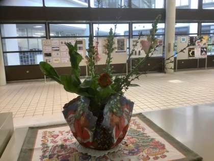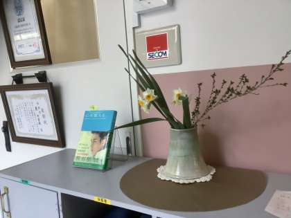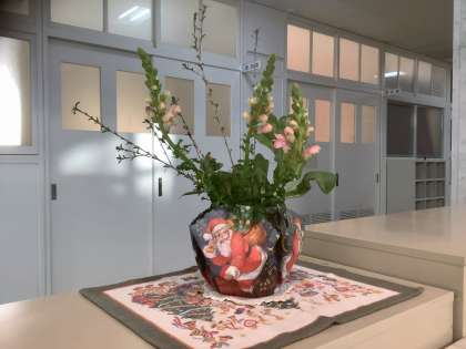 玄関ホールと職員室前のお花を生け替えていただきました。お花はロビーに「金魚草と金せん花」、「水仙」が職員室前に生けられています。ロビーの花器にはサンタクロースの笑顔がお花と共に心を和ませてくれます。