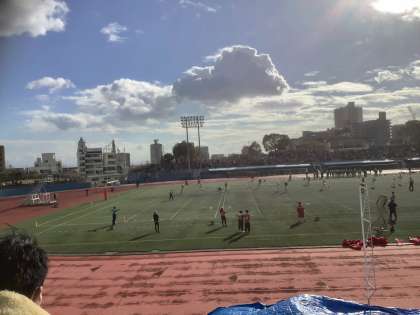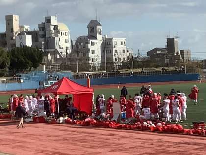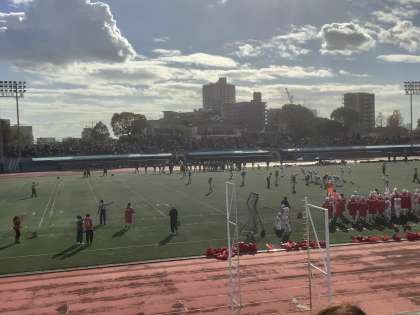 アメリカンフットボールの高校日本一をかけてのクリスマスボウル。前半(1・2Q)を終わって、14対7の大接戦。関西代表がリードです。