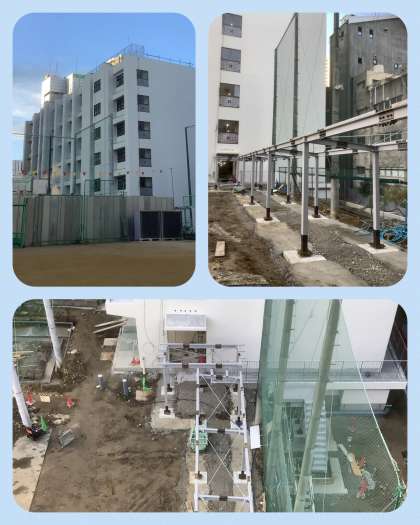 写真は、新旧校舎の全景、バックネットと体育倉庫の基礎部分、新校舎への通路と石垣下からの階段の様子です。3月の新校舎の完成・引き渡しに向けて、安全に配慮して工事が進みます。