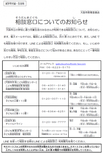 「相談窓口について」〜大阪市教育委員会からのお知らせ〜【再掲します】