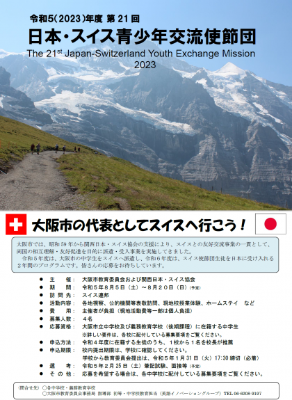 大阪市では、関西日本・スイス協会の支援により、スイスとの友好交流事業の一環として、両国の相互理解・友好促進を目的に派遣・受入事業を隔年で行い、グローバル人材の育成を図るとともに、国際的な信頼と友好の促進に資することを目的として「第21 回(令和5年度)大阪市立中学校生徒スイス派遣」を行います。