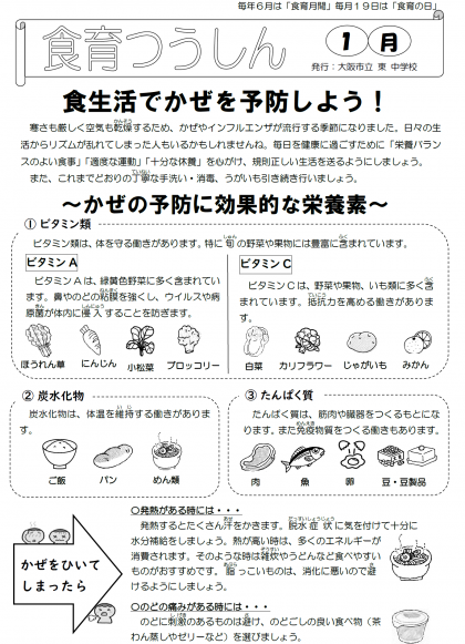 1月の「食育つうしん・給食で食を考えましょう」と「献立表」を掲載します
