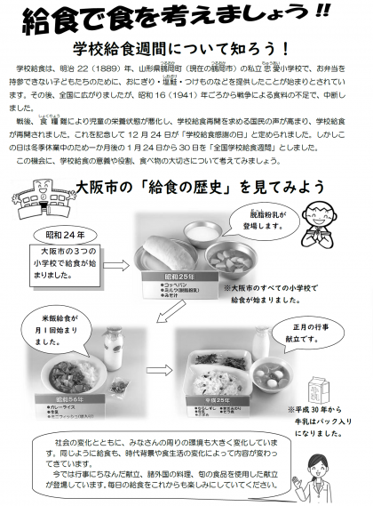 大阪市の「給食の歴史」や「全国学校給食週間」(1月24日から30日)に関する記事が掲載されている「1月給食で食を考えましょう 」はこちらをクリックしてご覧ください。