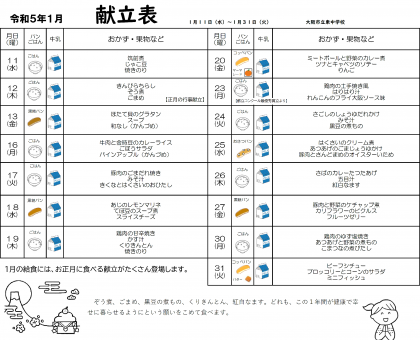 1月11日(水)から再開する給食の「1月献立表」はこちらをクリックしてご覧ください。