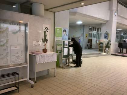また、同じ玄関ホールでは、生徒が登校する前に、昨年度に区長さまから表彰いただいた元気アップのスタッフの方が、生花の横の掲示板の整備や植木への水やりもしていただいています。今年もよろしくお願いします。