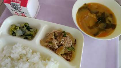 今日の給食は、豚肉のごまだれ焼き、みそ汁、きくなとはくさいのおひたし、ごはん、牛乳です。