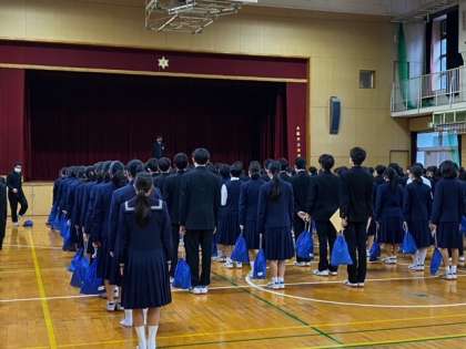 今朝、2年生の学年集会を行いました。2年生にとって、3学期は3年生になる準備期間としての学期です。ルールや学習に取り組む姿勢をもう一度見直しましょう。