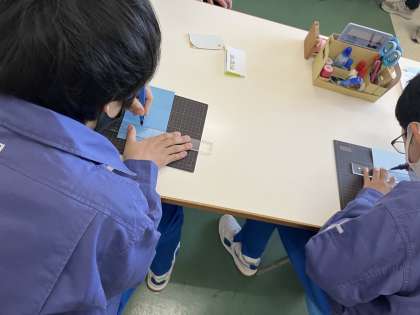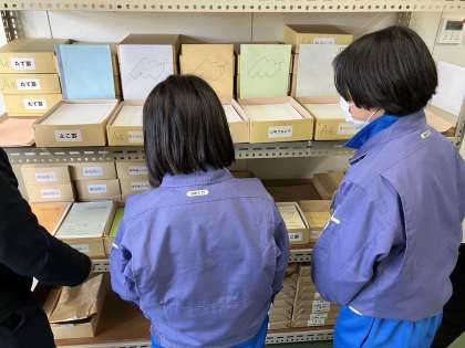 事務補助グループは名刺入れの用紙を選んでいます。名刺を作成した後、名刺入れを作ります。