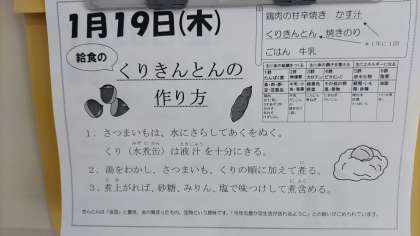 今日の話題は「くりきんとん」です。おせち料理にもはいっていますね。今年も皆さんは食べましたか?給食のくりきんとんには、栗がたくさん入っていましたが、皆さんはいもとくり、どちらが好きでしょうか。