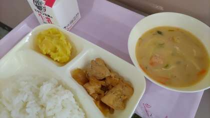 今日の給食は、鶏肉の甘辛焼き、かす汁、くりきんとん、焼きのり、ごはん、牛乳です。