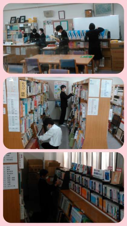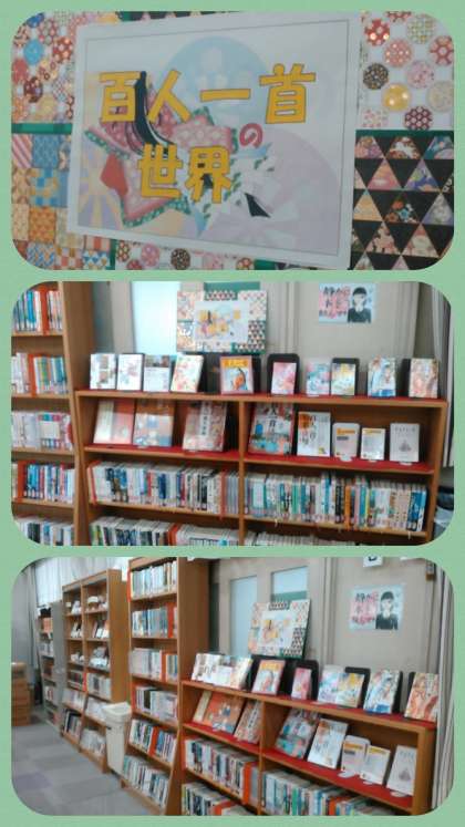 生徒の図書委員と元気アップのスタッフの方で開館している図書室。「百人一首の世界」のコーナーが、図書支援員の先生のコーディネートで新設されました。大人数が集まっての百人一首大会は見合わせていますが、学級ごとに百人一首に取り組んでいます。