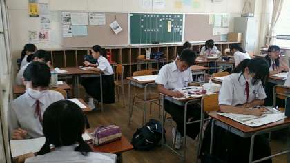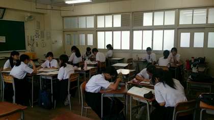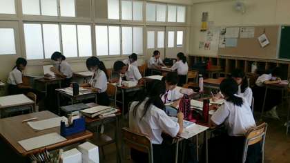 美術部は、秋の中学校総合文化祭やさまざまな作品展、コンクールへの出展に向けて、作品づくりに取り組んでいます。普段は美術教室で活動していますが、外は猛暑、この暑さでは、空調機が完備されていない美術教室では、活動になりません。快適な教室で、美術部員は楽しそうに、作品づくりに取り組んでいます!