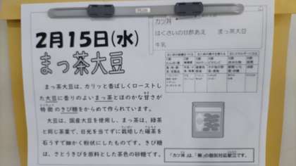 今日の給食は、かつ丼、はくさいの甘酢あえ、まっ茶大豆、ごはん、牛乳です。