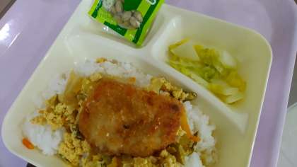 今日のメニューには、かつと卵の具が別添えになっていましたね。ご飯にのせて食べれば、とてもボリュームある一品になりました。また、はくさいの和え物も、歯ごたえも残っていて甘酢もさっぱり、とてもさわやかなおかずでした。皆さんはお仲一杯食べてくれましたか。