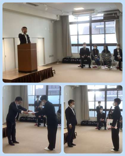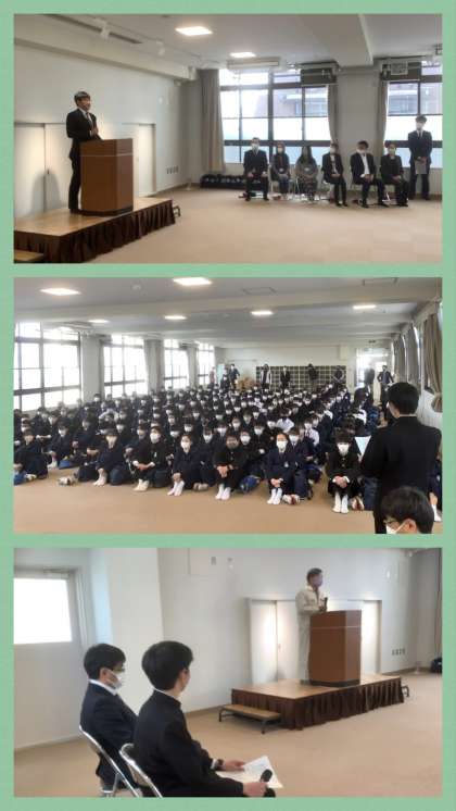 「新生」東中学校1期生の同窓会長さまと副会長さまにお越しいただき、同窓会入会式を執り行い、記念品をいただきました。第1期生の皆さんは、現在の中央高校地にあった「旧」東中学校の学舎で中学校生活を過ごされ、卒業式は現在の東中の体育館で行った様子などの貴重なお話をいただきました。ありがとうございました。