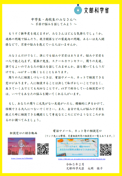 文部科学大臣メッセージ「〜不安や悩みがあったら話してみよう〜」(こちらをクリックしてご覧ください)