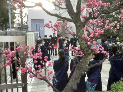 今日もソフトテニス部のメンバーが挨拶活動を展開しています。部長のラケットのスイングに合わせてのテニス部員の挨拶に、登校してくる生徒から元気よく挨拶が返ってきます。1日のスタートが挨拶で始まります。