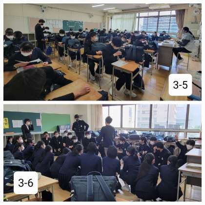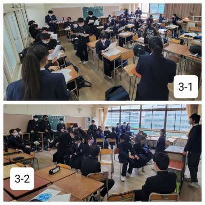 昨日の雨も明け方に上がり、穏やかな日となりました。3年生は明日で卒業となります。本日最後の学活のようすです。いろいろな思い出を胸に巣だっていってください。