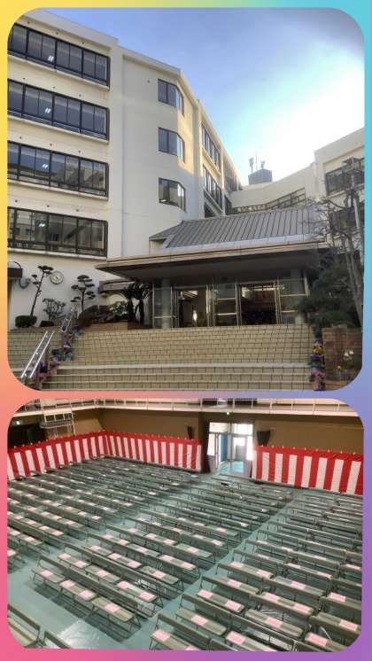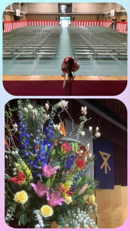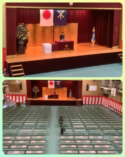 卒業式に向けて、在校生による清掃、会場設営、送辞の練習などが済み、準備万端です。あとは主役の卒業生とその保護者を迎え入れるばかりとなりました。開式は9時30分、開場は9時です。9時20分までに式場にご入場ください。また、マスクを着用し、入校証(健康状態確認証【桜色・空色】)に必要事項を記入のうえ、受付でお示しください。保護者の皆さまのご理解とご協力をよろしくお願いいたします。