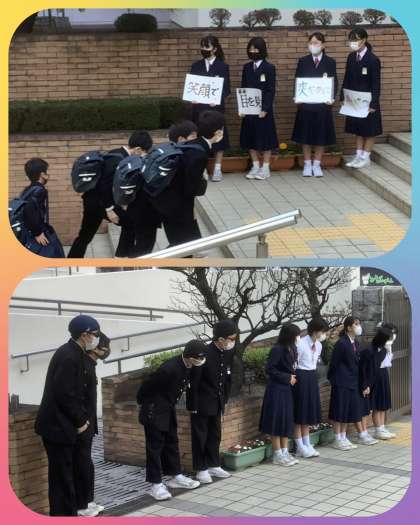 3学期も最後の一週間となりました。今日の挨拶活動は水泳部と生徒会です。登校する1・2年生の生徒の皆さんを元気に迎えてくれています。あと3日で今年度も終わります。時間に余裕をもって登校しましょう。
