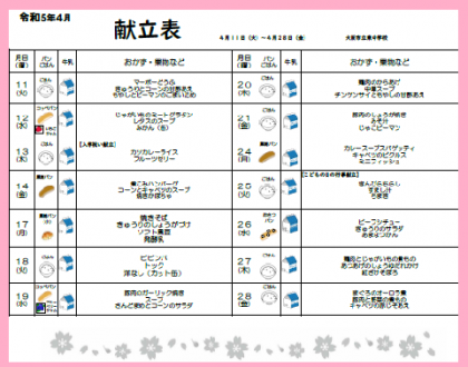 令和5年度4月の給食献立表(イラストVer)を掲載します(こちら)。
