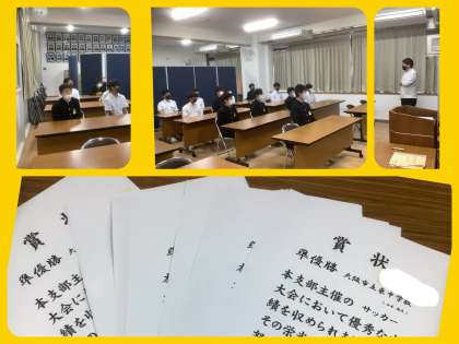 サッカー部のメンバーに、大阪市第3支部大会準優勝の個人表彰状を校長先生から伝達表彰しました。あらためてサッカー部の皆さんおめでとうございます。賞状を手にした事を励みに、今後のますますの活躍を期待しています。