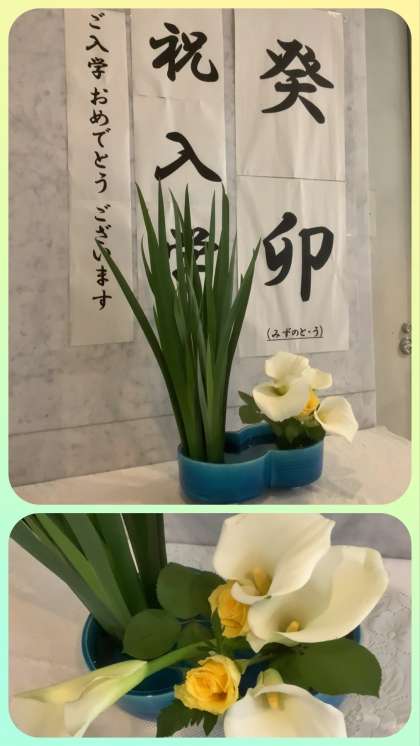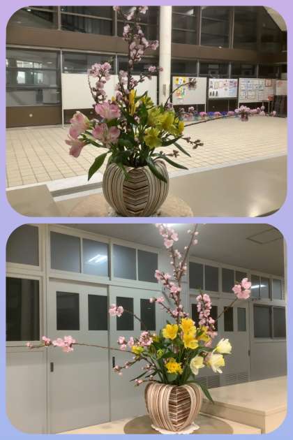 入学式は明日4月5日(水)。天気予報は曇り、降水確率は10%。今日は、在校生が式場の設営をします。玄関等のお花も、入学式に合わせて生け替えていただきました。玄関には、「新生」のお題で「カラー・バラ・オクラレウカ」。ホールには「梅・アルストロメリア・水仙」、職員室前には「バイモ(アミガサユリ)・アルストロメリア」が生けられています。いつも東中生のためにありがとうございます。今年度もよろしくお願いします。