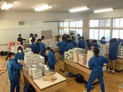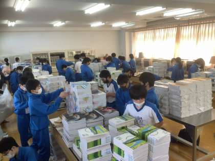 新しい学年で使う教科書の仕分けを代表生徒としています。約700人の生徒の皆さんに、教科書がスムーズに手渡るための準備です。生徒の皆さんは、ノートなどの必要な文房具を用意するなど、新学期の準備を進めていきましょう!始業式は4月10日(月)です。
