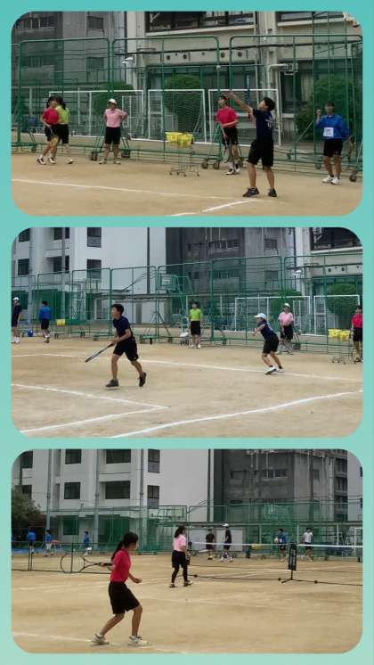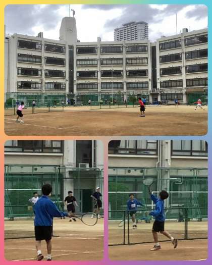 薄曇りの中、桜に見守られるように、全面が使えるようになったグランドで、ソフトテニス部が活動しています。コートが3面、ゆったり取れています。グランドにはまだ凸凹が残り、小石も転がっていますが、少しずつ整地をして、整えていきます。