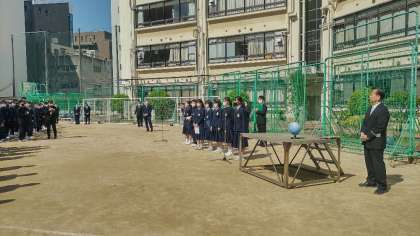 着任式、始業式と続いた後は、生徒会が主催して対面式を行いました。2・3年生が1年生を迎えるため、互いに向かい合って、それぞれの代表生徒から挨拶をしてもらいました。