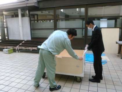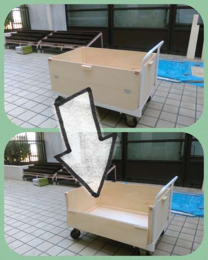 一方で、調理のためには、当然ゴミが出ます。しかし、給食室とゴミ置き場が学校の敷地の対角の位置にあり、通常の台車でゴミを運ぶとかなりの距離をかなりの回数往復しないといけないことがわかりました。そのことを聞きつけた管理作業員が、大きめの台車に木箱を設置し、ゴミを運搬しやすいようにと作ったのがこの台車です。手前には、力の弱い方でも乗せやすいように扉をつけるユニバーサルな構造になっています。朝に課題に気付き、夕方には完成と匠の技がここでも発揮されました。
