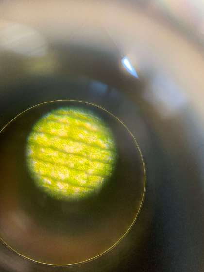 最近のカメラはよくできていて、顕微鏡を覗くと写真のようにオオカナダモ(※)の細胞がよくみえると先生に教えていただきました。写真より。
