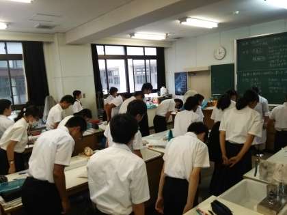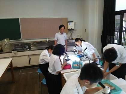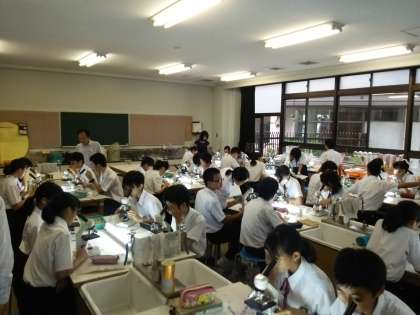 谷田先生の授業は、顕微鏡観察です。前回の「玉ねぎ」の葉の薄皮に続き、本日は「自分のほおの内側の表皮細胞」の観察をしました。玉ねぎとは違い観察はなかなか難しいようでしたが、徐々に目的の細胞にピントが合い始めました。スケッチもし、次にはそれをもとに動物細胞と植物細胞の違いと同じところを、班の話し合いで探っていきます。話し合った内容を、各班の中でひとりずつ指名され(だれかわかりませんのでドキドキ)発表していきます。全員に1台ずつの顕微鏡があるので、余裕をもって観察・スケッチ・話し合いができました。