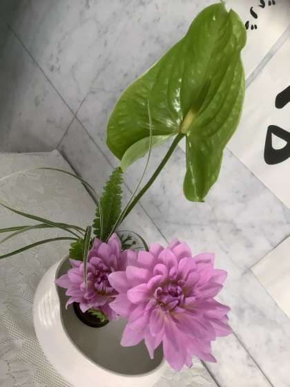 花のお題は「対話」。学級開きの今の時期にぴったりのお題です。お花は「ダリア・アンスリューム・マーガレット・玉しだ・ミソカンサス」です。