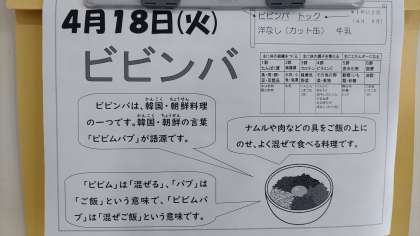 ビビンバもトックも韓国料理ですね。給食にはありませんでしたが、卵黄を載せたり、コチュジャンを載せたりしてお店で出てきます。中には「石やき」という名で、火で熱く熱した石の器に盛られたものもありますね。石焼ビビンバは、ご飯がお焦げになって、香ばしく食べることができたり、そこにスープをかけて食べたりと、食べ方にもバリエーションが生まれます。皆さんは石焼ビビンバの方が好きでしょうか?