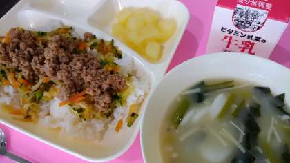 今日のメニューは、ビビンバ、トック、洋なし、牛乳でした。