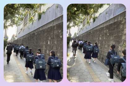 全校生徒が700人になり、登校時間の玄関前の歩道は人でいっぱいになります。この時間は、出勤時間と重なるので、東中生は、駅からは2列で石垣側を歩いています。出勤を急がれる方や、自転車に乗る高校生に左側を空けています。