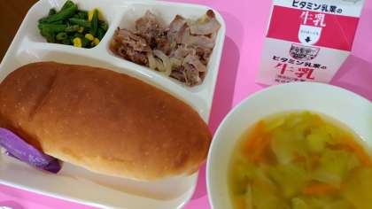 今日のメニューは、豚肉のガーリック焼き、スープ、さんどまめとコーンのサラダ、コッペパン、ブルーベリージャム、牛乳です。