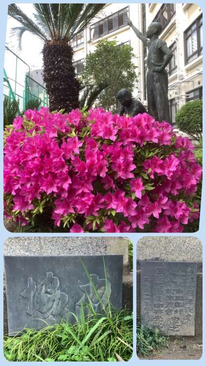 つつじの横には、東中学校の前身の1校である船場中学校の創立10周年を記念して建立された銅像があり、当時の大阪市長である中井様の「協力」の題字が見られます。