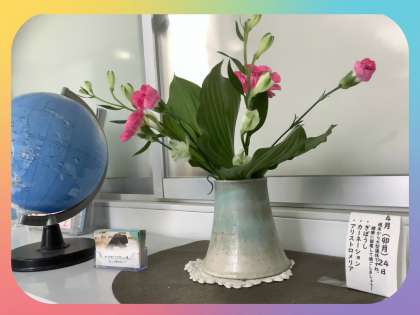 玄関ホールと職員室前のお花を生け替えていただきました。いつも東中生のためにありがとうございます。玄関ホールには「アリストロメリア・なでしこ・ヒペリカム・ぎぼうし」、職員室前には「ぎぼうし・カーネーション・アリストロメリア」が、東中生を優しく見守ってくれているようです。